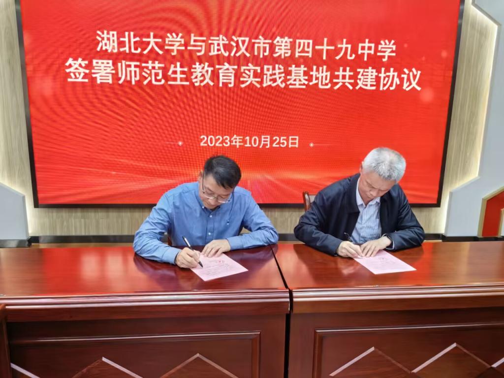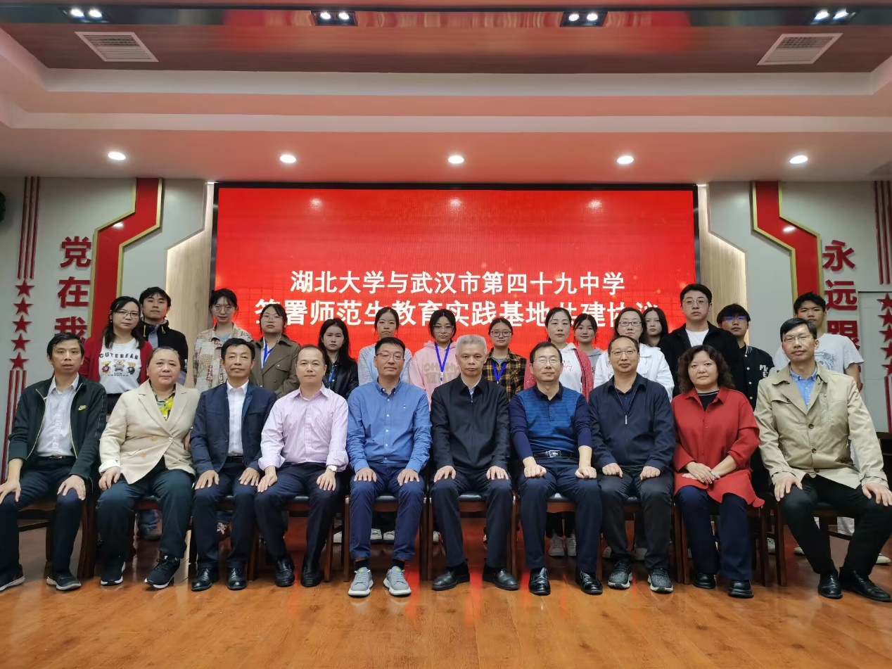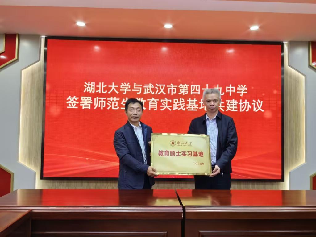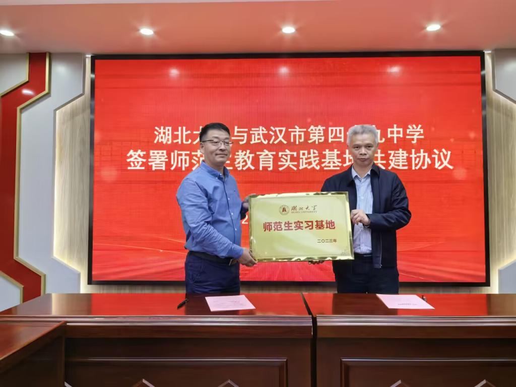 10月25日,太阳成集团tyc234cc与武汉第四十九中学共建师范生和教育硕士教育实践基地签约暨授牌仪式在四十九中学隆重举行。武汉第四十九中学董事长胡正茂、副董事长肖毅,太阳成集团tyc234cc副经理祝逸明、生命科学公司副书记张精文、副经理杨之帆等共同出席签约授牌仪式。仪式由武汉第四十九中学教导处主任皮佳荔主持。