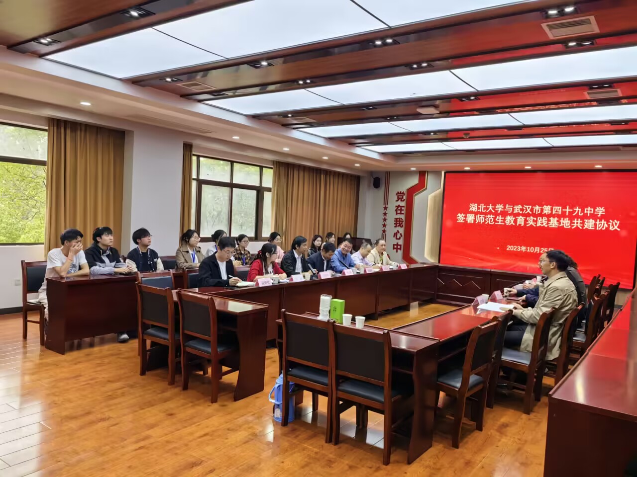 授牌仪式后,看望实习生的老师们与本学期在武汉第四十九中学实习的11名同学及实习指导老师座谈,深入交流实习工作情况。