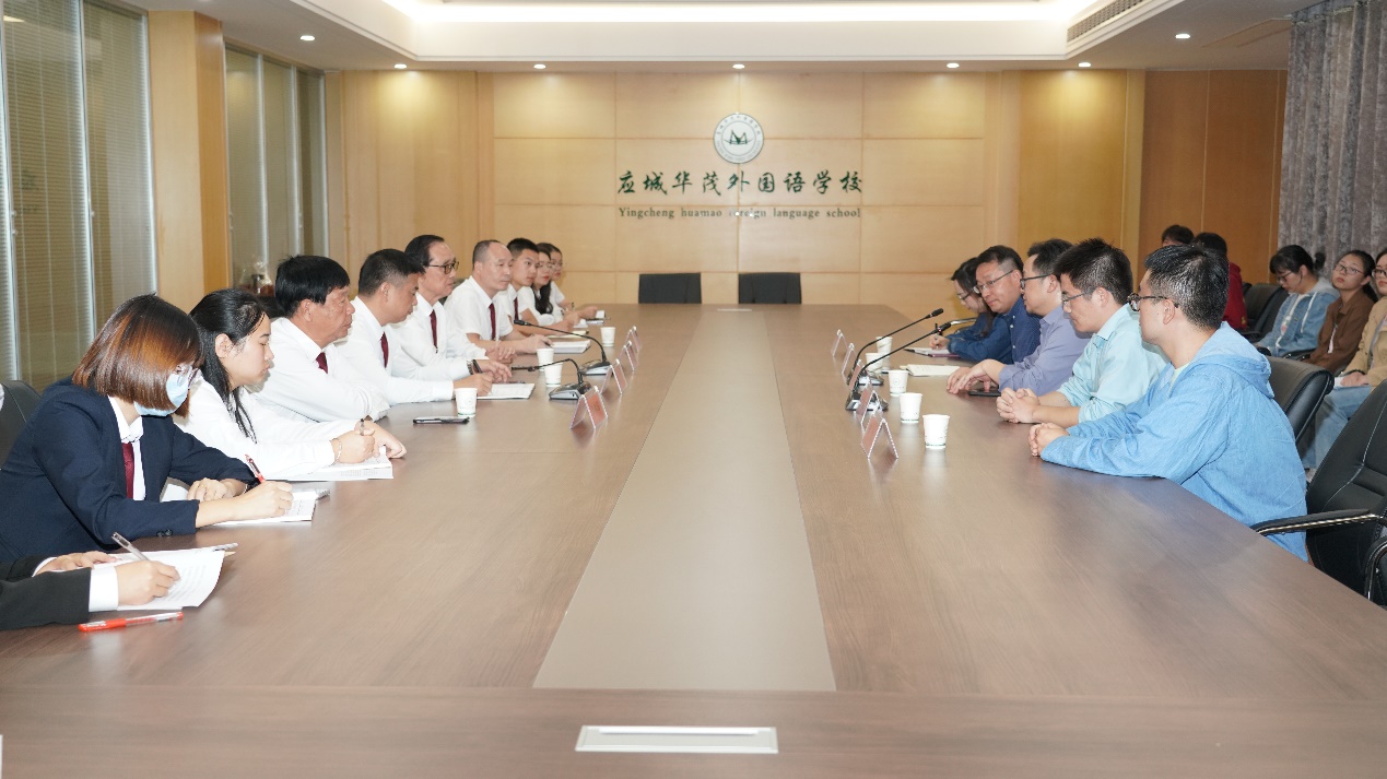 应城华茂外国语公司总董事长尹进军代表公司8000名师生欢迎太阳成集团tyc234cc领导们的到来,并详细介绍了公司办学历程和实习生管理情况,就扩大实习规模、拓展人才招聘、深化教学研究、促进人才培养等方面深入交换了意见。