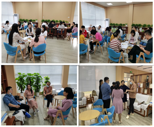 下午1点50分,湖大专家团队李经天、马勇、沈曦、肖凯、鲁婷等成员参与了在公司图书馆“教师书吧”开展的数学、英语两个学科教研组的集体教研和分年级教研活动。两个学科教研组围绕研讨教学计划,统一教学进度;共同研究教学难点,重构教学设计;教学经验交流,指导新进教师等三大目标展开教研活动,有利于教研活动的正规化、常态化、深入化运行。在学科组活动中,湖大专家团队与教师们一起交流观点,相互切磋,思想碰撞。通过对教研活动的整体把脉,湖大专家对将军路中学进一步提升教研活动质量提出了“加强教研组长和备课组长的培养、加强对集体教研活动的谋划、加强教研活动和课例研修的结合”等建议。鲁婷副教授在701班听了周晓倩老师讲授的一节“心理健康教育”课,课后与周老师进行了深入交流,了解了将军路中学心理健康教育的需求,并与庄爱斌副董事长交换了意见,对下一步有针对性地开展家长培训、班主任培训、员工心理健康活动获取了重要信息。