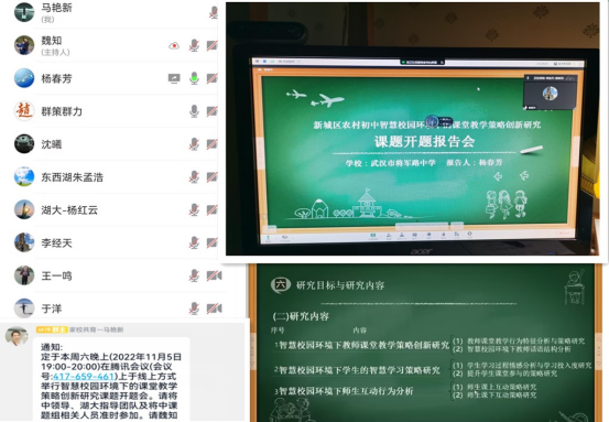 2022年11月5日(周六)晚上19:00—20:30分,将军路中学在腾讯会议举行区级教研课题《智慧校园环境下的课堂教学策略创新研究》开题论证会。湖大专家团队李经天、马勇、于洋、杨红云、沈曦、肖凯、罗淑娟及将军路中学董事长赵群立、课题组课题组成员王一鸣、杜莹、魏知、洪巧玲、朱孟浩、胡伟刚、蔡雅琴、张书蔚、袁桐,余庆庆,杨春芳等参加了会议。教科室主任马艳新老师主持会议。