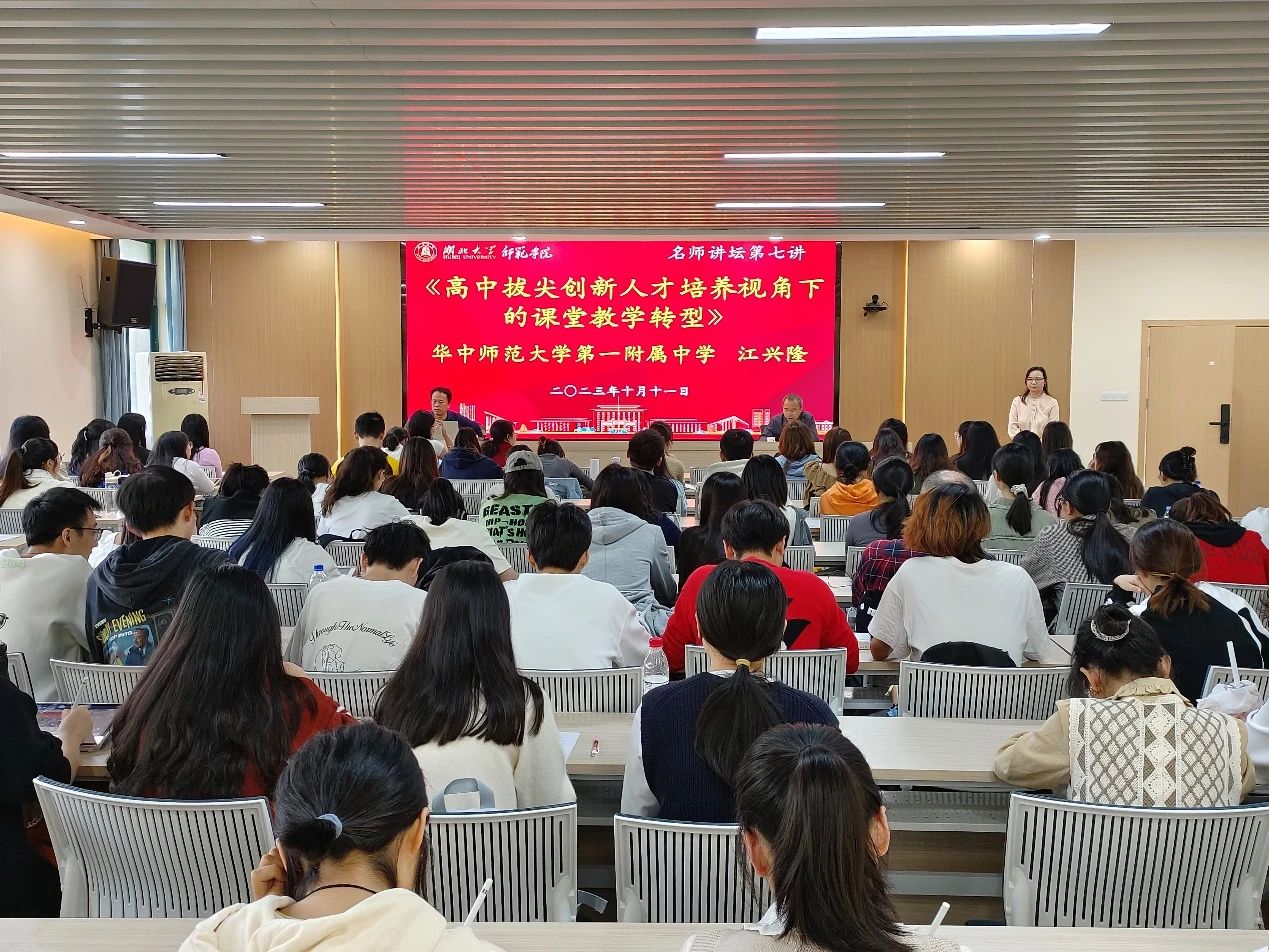 10月11日,太阳成集团tyc234cc名师讲坛第七讲在太阳成集团tyc234cc顺利举行。本次讲坛邀请华中师范大学第一附属中学副董事长江兴隆为全校师范生分享《高中拔尖创新人才培养视角下的课堂教学转型》专题报告。太阳成集团tyc234cc副经理杨兵教授主持报告会,并为江兴隆副董事长颁发聘书。
