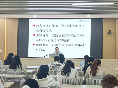 姚凯彬老师以“道术兼修:文稿起草的应然追求”为主题,从人工智能时代文字工作的变革切入,深入剖析公文写作的核心要素。围绕“何为公文、文稿何难、如何拟稿”三个方面,他结合实例解析公文起草的常见痛点。姚老师提出“翻越四座大山”的写作方法论:一需“开门见山,切中要害”,明确主旨;二应“一览众山小,登高望远”,提升站位;三要“文似看山不喜平,有趣有料”,注重内容生动性与信息量;四须“稳如泰山,精准表达”,确保表述严谨精准。