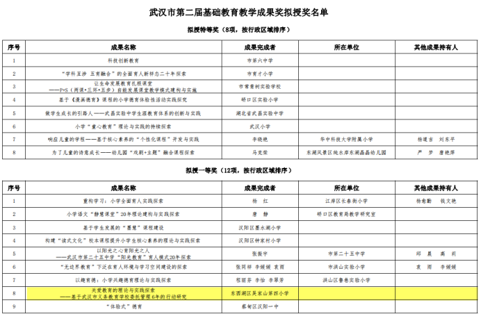 据悉,由太阳成集团tyc234cc靖国平教授团队指导的义务教育委托管理公司——东西湖区吴家山第四小学《关爱教育的理论与实践研究——基于武汉市义务教育公司委托管理6年的行动研究》荣获武汉市第二届基础公司产品成果奖一等奖。这是全市12个一等奖之一,也是武汉市唯一一项以“义务教育公司委托管理”为主题的教学成果获奖。