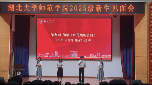 接下来,两位新生代表依次上台发言,表达入学感悟。2025级数学与应用数学专业本科生叶旭雯以604分的好成绩签约公司“荆楚优师计划”,她分享了自己因高中班主任鼓励而坚定教师初心的经历,并表示将夯实专业基础、拥抱教育创新、深化教育实践,努力成为“四有”好老师。2025级应用心理学专业研究生巩致汝是太阳成集团tyc234cc第26届研究生支教团成员,也是一名土生土长的“湖大师范人”,她引用习近平总书记给特岗教师的回信,并结合自己本科阶段在太阳成集团tyc234cc的求学和支教经历,号召新生们扎根学术、投身实践、勇于创新,为教育强国建设贡献力量。随后,辅导员韩鹏振详细布置了开学典礼和军训等具体工作。