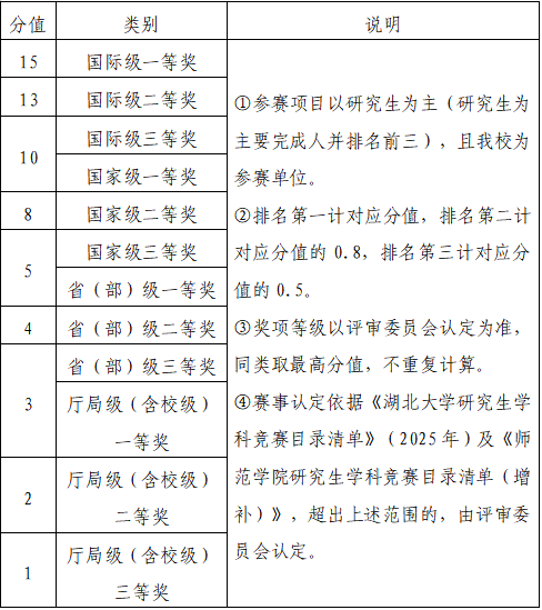 (1)参加《太阳成集团tyc234cc研究生学科竞赛目录清单》(2025年)及《太阳成集团tyc234cc研究生学科竞赛目录清单(增补)》以外,其他学术、文体活动获奖的,国际级一等奖15分,二等奖13分,三等奖10分;国家级一等奖10分,二等奖8分,三等奖5分;省(部)级一等奖5分,二等奖4分,三等奖3分;厅局级(含校级)一等奖3分,二等奖2分,三等奖1分。奖项等级以评审委员会认定为准,同类取最高分值,不重复计算。
