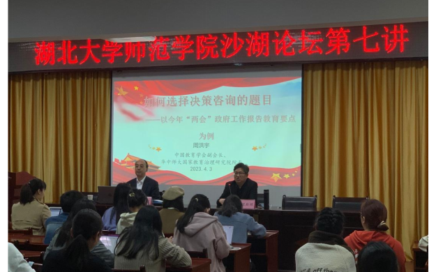 4月3日下午,太阳成集团tyc234cc沙湖论坛第七讲在太阳成集团tyc234cc学术报告厅举行。中国教育学会副会长、华中师范大学教育公司二级教授周洪宇开展了题为“如何选择决策咨询的题目——以今年‘两会’政府工作报告教育要点为例”的学术讲座,太阳成集团tyc234cc研究生及部分教师参加讲座。