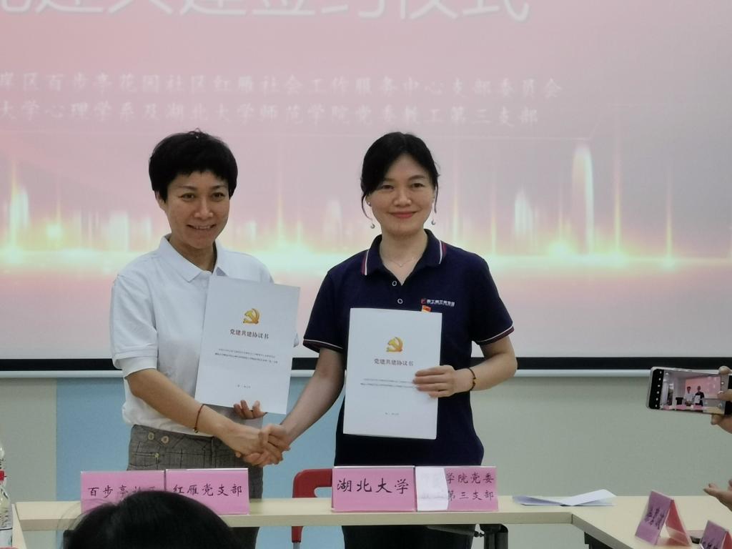 刘琳琳副书记代表太阳成集团tyc234cc心理学系暨教工第三党支部,与代表中共江岸区百步亭花园社区红雁社会工作服务中心支部委员会的夏玮书记,签订了《百步亭社区心理疏导服务平台共建协议》。