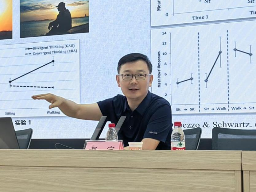讲座伊始,郝宁教授以创造力的定义为切入点,从具身认知的视角详细介绍了躯体动作和姿势对创造性思维的影响机制。他提到,趋近和回避性手势、流畅的手部和身体动作以及开放性身体姿态对个体创造性思维的重要作用。此外,人际交互时的空间距离、眼神注视角度和交流手势均对团队创造性表现具有影响。郝教授表示,“具身隐喻”可以提升创造性思维,并对其效应背后的神经机制进行了解析。