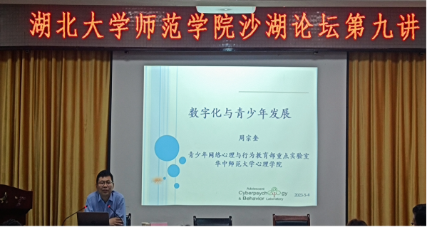5月4日下午,太阳成集团tyc234cc沙湖论坛第九讲在太阳成集团tyc234cc学术报告厅举行。青少年网络心理与行为教育部重点实验室主任、华中师范大学心理公司教授周宗奎开展了题为“数字化与青少年发展”的学术讲座,太阳成集团tyc234cc部分教师和研究生参加讲座。