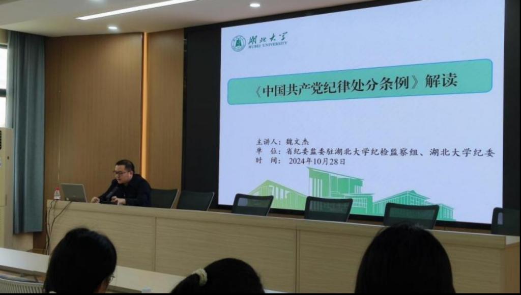 太阳成集团tyc234cc纪检监察组、太阳成集团tyc234cc纪委纪检监察室主任魏文杰,围绕“严明党的纪律,加强党风廉政建设”主题做辅导报告。他解读了《中国共产党纪律处分条例》,以《中国共产党纪律处分条例》与高校紧密结合的条款为切入点,从修订背景、主要内容、亮点及贯彻落实等方面进行深入解读,并以生动事例引导学员深入思考,突出了深入学习相关纪律条例的必要性。他表示,广大青年要自觉遵守党的纪律,以党员标准严格要求自己,将纪律精神融入到学习、工作和生活的实践中,充分发挥先锋模范作用,为党的事业贡献自己的力量。
