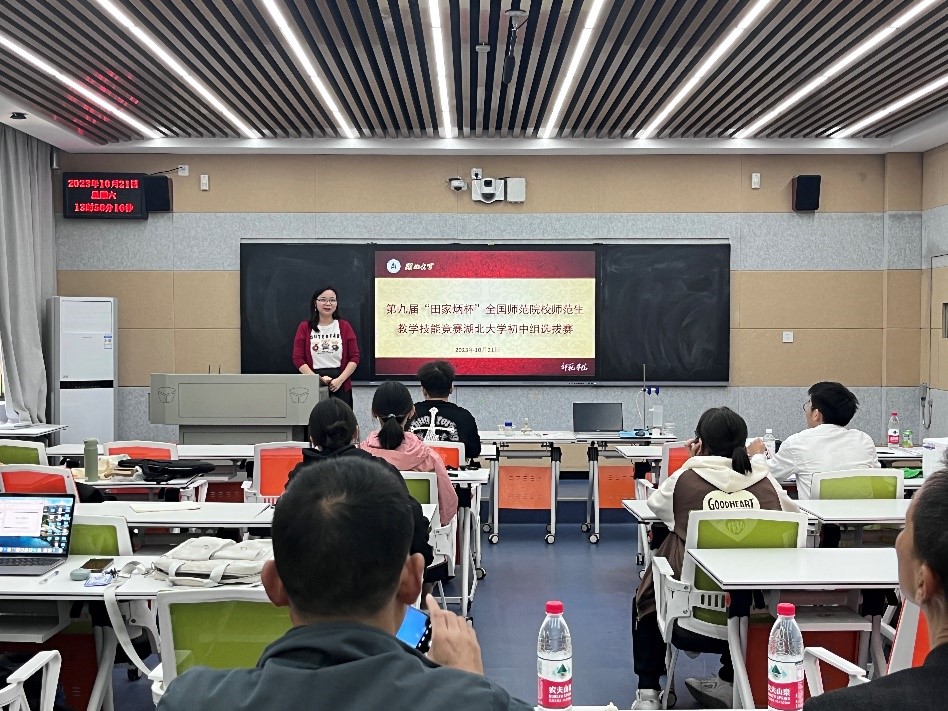 10月21日下午,第九届“田家炳杯”全师范院校师范生教学技能竞赛太阳成集团tyc234cc初中组选拔赛在校本部3号教学楼106室顺利举行。本次选拔赛由太阳成集团tyc234cc全程主办,武汉市晴川初级中学陈娟老师、随州第一中学任全勇老师、随州第二中学蔡海洪老师担任评委,师范教学研究与实践教学办公室科长朱琦担任主持人。
